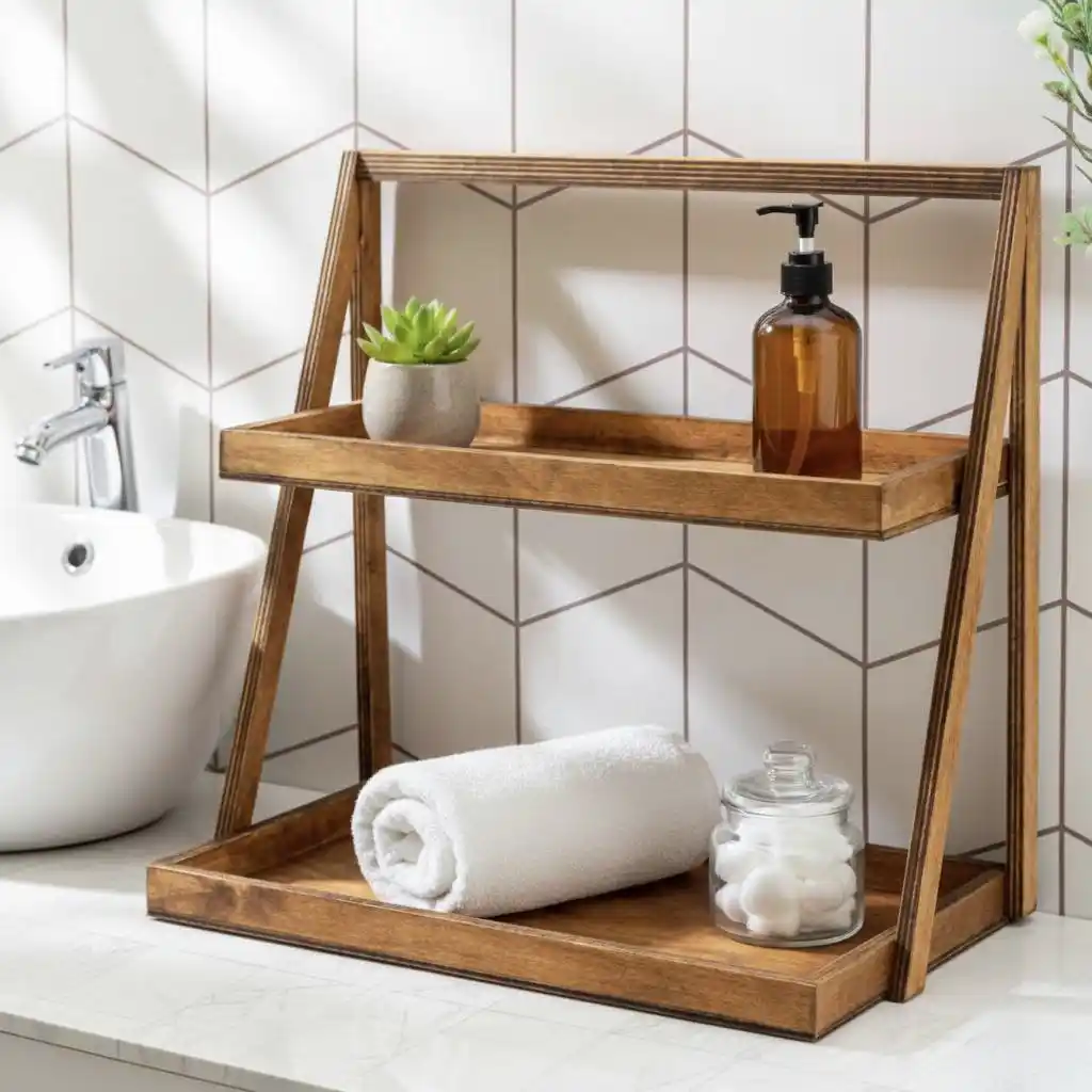 ما این استند را به دلیل «طراحی نردبانی (A-Frame)» و «بافت طبیعی چوب» انتخاب کردیم. این مدل برخلاف شلفهای دیواری، نیاز به سوراخکاری ندارد و به راحتی جابهجا میشود. ترکیبِ گرمای چوب با رنگ خنثیِ کاشیهای آشپزخانه، فضایی دنج و اصطلاحاً «روستیک» ایجاد میکند که در آن، حتی سادهترین بطریهای روغن یا گلدانهای کوچکِ کاکتوس هم مانند یک اثر هنری به نظر میرسند.